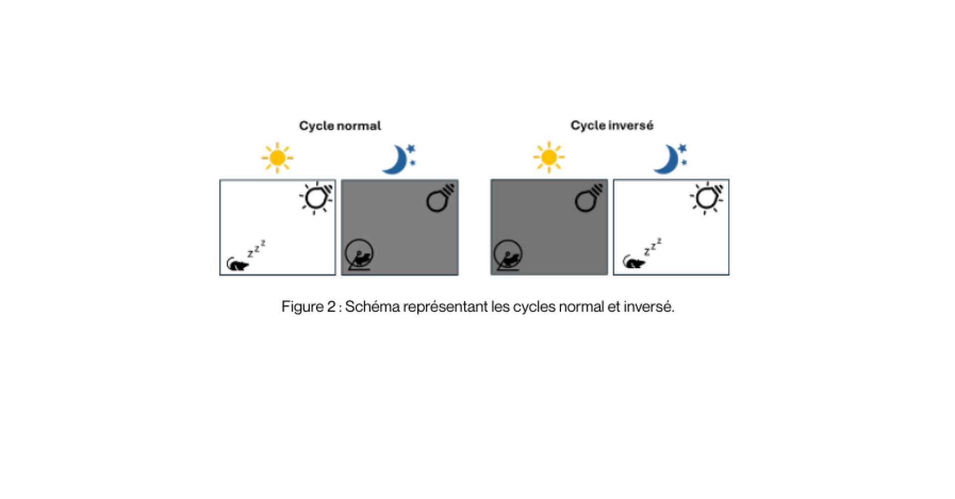 Dans la majorité des animaleries, surtout de statut sanitaire non conventionnel, l’éclairage est entièrement artificiel. La création d’une photopériode correspondant au cycle naturel des animaux est essentielle et obligatoire. Il est possible dans certains cas d’inverser le cycle lumière/obscurité afin de manipuler les souris, animaux nocturnes, durant leur phase d’éveil (voir Figure 2).