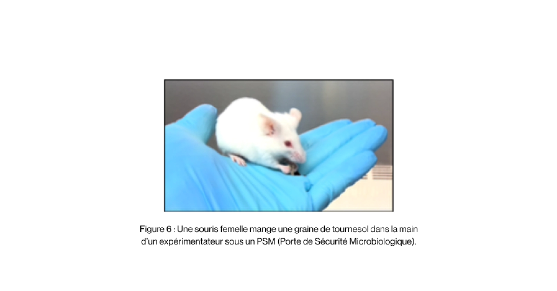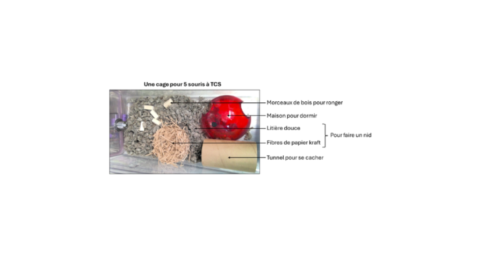 A TransCure bioServices, les souris ont accès à une litière particulièrement douce et à des fibres de papier kraft ce qui leur permet de creuser et de construire un nid chaud et bien structuré. Une petite maison et un tunnel sont utilisés pour que les souris se cachent ou dorment. En plus de croquettes, elles ont un morceau de bois par souris pour qu’elles puissent ronger et maintenir leurs dents en bonne santé. Des graines de tournesol sont utilisées comme friandises pour ces petits rongeurs qui les adorent (voir Figure 6).